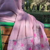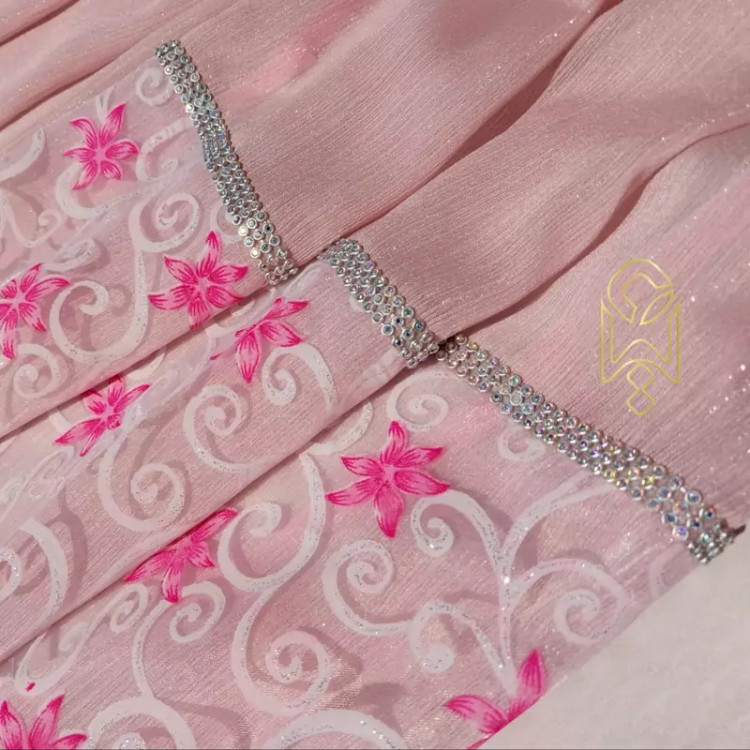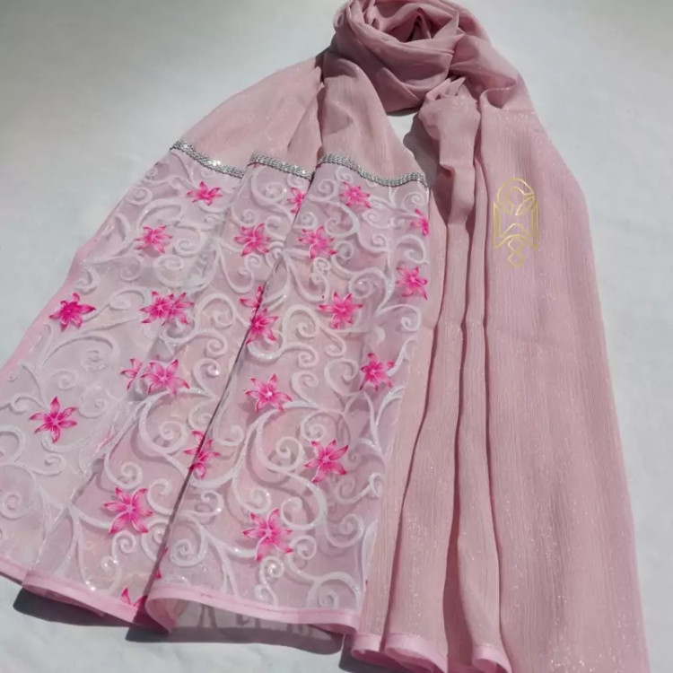 شال مجلسی حریر کریشه شاین صورتی با دستک حریر گلدار